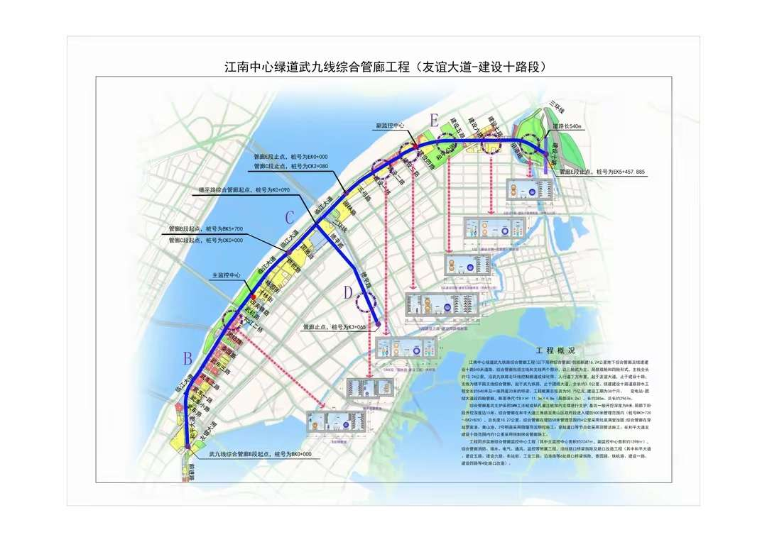 作為省市兩級重點(diǎn)工程,武九綜合管廊全長約16.2公里,是武漢市城市地下綜合管廊專項(xiàng)規(guī)劃確定的重要干線管廊,創(chuàng)下多個(gè)“國內(nèi)之最”。它是國內(nèi)城市核心即老城區(qū)單次建設(shè)規(guī)模最大(長度、斷面)的綜合管廊,是服務(wù)城市核心功能區(qū)(武昌濱江商務(wù)區(qū)、青山濱江商務(wù)區(qū)、華中金融城)數(shù)量最多的綜合管廊。