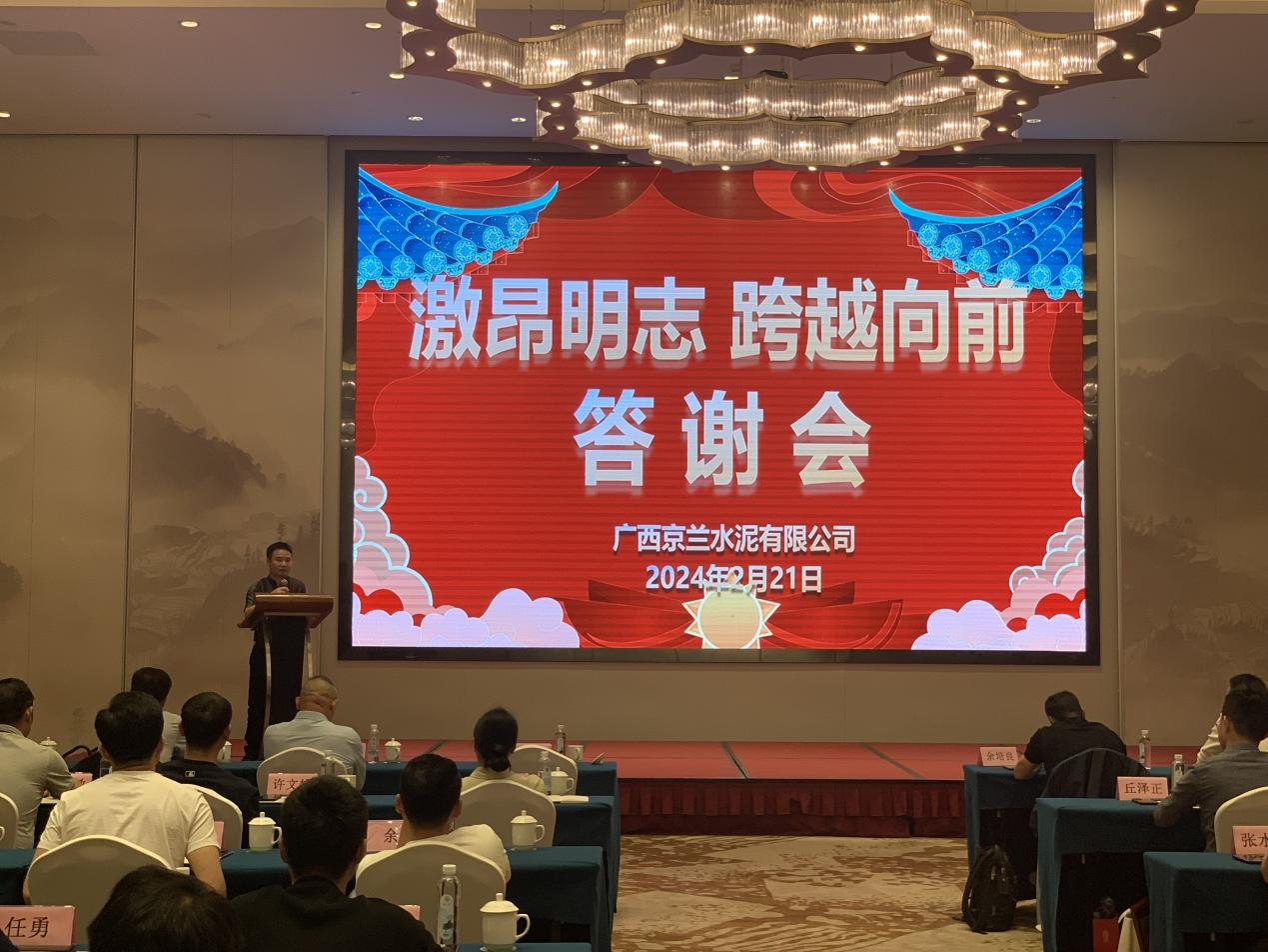 2024年2月21日,廣西京蘭水泥有限公司在柳州蓮花山莊召開(kāi)以“激昂明志,跨越向前”為主題的2023年度代理商年終總結(jié)大會(huì)暨答謝會(huì),共有來(lái)自?xún)蓮V各地近20個(gè)地市、40余位合作代理商參加了本次盛會(huì),會(huì)議在熱情洋溢的氛圍中成功舉辦。